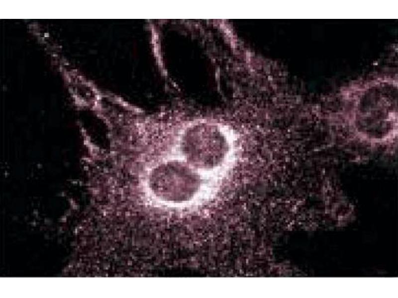 Clathrin is the major protein component in the coat formed around pits and vesicles involved in receptor-mediated endocytosis. Clathrin forms a non-covalently bound triskelion structure composed of three heavy chains (192kDa each) and three light chains (23-25kDa each). A variety of proteins facilitate receptor-mediated endocytosis through association with clathrin-coated vesicles. Huntingtin interacting protein 1 (Hip1) is an actin-binding protein that interacts with Huntingtin protein, and has been implicated in vesicular transport defects found in Huntingtin's disease. Hip1 related protein (Hip1R) is another actin binding protein that contains an epsin NH2-terminal homology (ENTH)domain, three coiled-coil regions, a leucine zipper, and a talin-like actin binding domain. Hip1R mRNA is widely expressed, and Hip1R protein is enriched in the cell cortex and perinuclear region. The ENTH domain of Hip1R is required for binding to phosphatidylinositol-4,5-bisphosphate, and this complex is essential for clathrin-mediated endocytosis. In addition, Hip1R colocalizes with clathrin, AP-2 and endocytosed transferrin. Thus, Hip1R may facilitate interactions between clathrin-coated pits and actin during endocytosis.