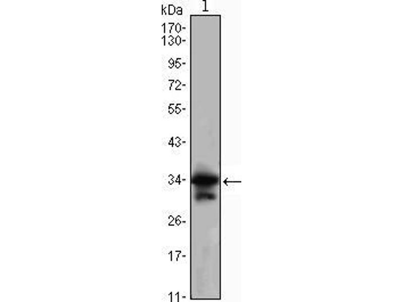The cell division control protein cdc2, also known as cyclin-dependent kinase 1 (Cdk1) or p34/cdk1, plays a key role in the control of the eukaryotic cell cycle, where it is required for entry into S-phase and mitosis. Cdc2 exists as a complex with both cyclin A and cyclin B. The best characterized of these associations is the Cdc2 p34 cyclin B complex, which is required for the G2 to M phase transition. Activation of Cdc2 is controlled at several steps including cyclin binding and phosphorylation of threonine 161. However, the critical regulatory step in activating cdc2 during progression into mitosis appears to be dephosphorylation of Tyr15 and Tyr14. Phosphorylation at Tyr15 and inhibition of Cdc2 is carried out by WEE1 and MIK protein kinases while Tyr15 dephosphorylation and activation of Cdc2 is carried out by the cdc25 phosphatase. The isoform CDC2deltaT is found in breast cancer tissues. Furthermore, cdc2/Cdk1 is a key mediator of neuronal cell death in brain development and degeneration.