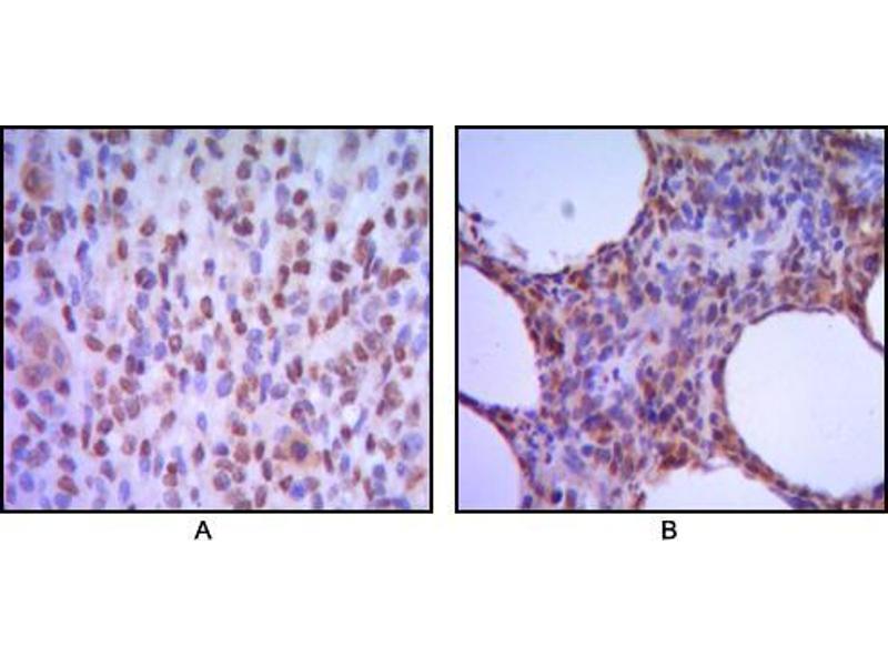Mutated melanoma-associated antigen 1 (MUM1) is a 78 kDa protein encoded by the MUM1 gene. MUM1 is expressed in a subset of B cells in the light zone of the germinal center, plasma cells, activated T cells and a wide spectrum of related hematolymphoid neoplasms. Antibodies to MUM1 are useful in the sub classification of lymphoid malignancies.