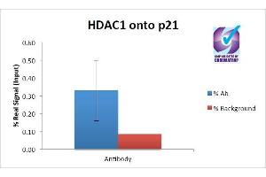 Chromatin Immunoprecipitation: A 4-fold increased presence of H3 onto the Human P21 locus observed when comparing the precipitations using EB11428 with non-specific goat IgG to bring down HDAC1 in a chromatin lysate from MCF7 cells.