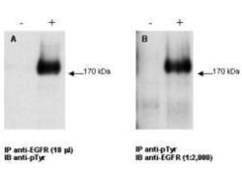 Application Note: Anti-EGFR antibody has been tested by and is specifically designed for ELISA, immunoblotting, immunoprecipitation, and immunohistochemistry. Reactivity in other assays is likely, but has not been determined. Recognition of EGFR is independent of the phosphorylation status at tyrosine 1173. A431 cells, keratinocytes in normal epidermis, or placenta are typically used as positive control sources. The antigen is typically localized in the cell membrane. For western blotting, good results are also achieved on PVDF membranes blocked with 5 % lowfat milk diluted in TTBS for 1 hour at room temperature. Also, dilute the primary antibody and secondary in 5 % lowfat milk in TTBS. Anti-EGFR can be diluted up to 1:10,000 for immunoblot depending on the cell line and the amount of EGFR in a particular lysate. For immunoprecipitation, use approximately 10 μL of the antibody. The immunoprecipitation mix should contain the antibody, 25 μL of Protein A-agarose beads and 1.0 mL of lysate (lysate contains approximately 1.0 mg of total protein). This mixture should be rotated overnight at 4 °C and then washed 3 times with lysis buffer (used to prepare the lysate). The resulting bead complex is dissolved in 20-30 μL of 3X SDS-PAGE sample buffer and approximately 15 μL is loaded per lane on an 8 % polyacrylamide gel.
