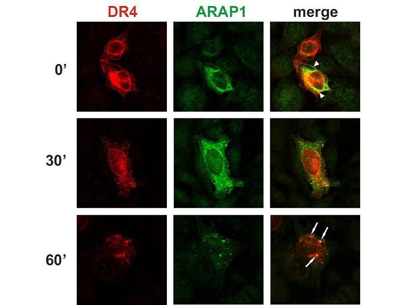 : "ARAP1 regulates the ring size of circular dorsal ruffles through Arf1 and Arf5." in: Molecular biology of the cell, Vol. 23, Issue 13, pp. 2481-9, (2012) (PubMed).: "Arf and Rho GAP adapter protein ARAP1 participates in the mobilization of TRAIL-R1/DR4 to the plasma membrane." in: Apoptosis : an international journal on programmed cell death, Vol. 13, Issue 3, pp. 423-36, (2008) (PubMed).