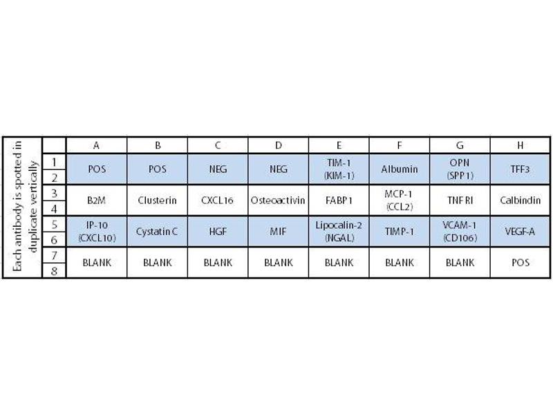 - TIM-1 (KIM-1), Albumin, Osteopontin (SPP1), TFF3 (Trefoil Factor 3), Beta-2 Microglobulin, Clusterin, CXCL16, Osteoactivin (GPNMB), FABP1, MCP-1 (CCL2), TNF RI (TNFRSF1A), Calbindin, IP-10 (CXCL10), Cystatin C, HGF, MIF, Lipocalin-2 (NGAL), TIMP-1, VCAM-1 (CD106), VEGF-A