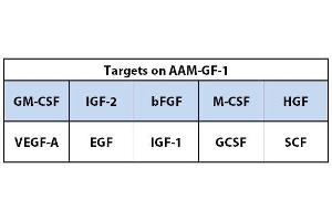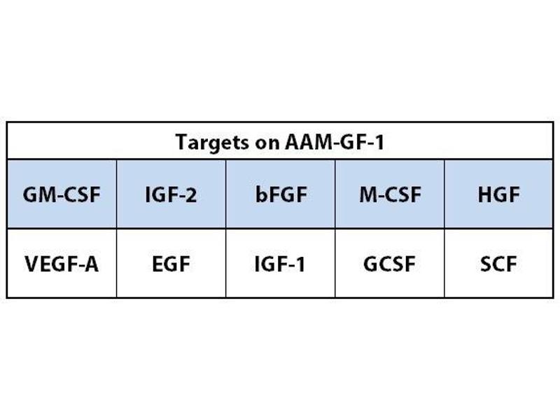 - BFGF, EGF, GCSF, GM-CSF, HGF, IGF-1, IGF-2, M-CSF, SCF, VEGF-A