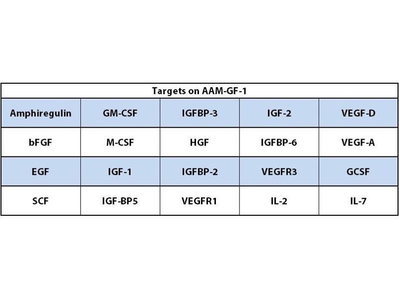 - Amphiregulin, bFGF, EGF, GCSF, GM-CSF, HGF, IGF-1, IGF-2, IGFBP-2, IGFBP-3, IGFBP-5, IGFBP-6, IL-2, IL-7, M-CSF, SCF, VEGF-A, VEGF-D, VEGFR1, VEGFR3
