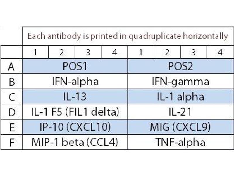 - IFN alpha, IFN-gamma, IL-13, IL-1 alpha (IL-1 F1), IL-1 F5 (FIL1 delta), IL-21, IP-10 (CXCL10), MIG (CXCL9), MIP-1 beta (CCL4), TNF alpha