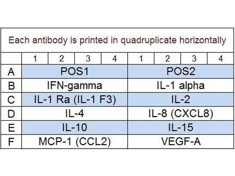 - IFN-gamma, IL-1 alpha (IL-1 F1), IL-1 Ra (IL-1 F3), IL-2, IL-4, IL-8 (CXCL8), IL-10, IL-15, MCP-1 (CCL2), VEGF-A