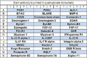 ALK-1, B7-H2 (ICOS Ligand), BLAME (SLAMF8), BMP-8, CD28, Common beta Chain, Contactin-1, Desmoglein-1, Desmoglein-3, EDAR, EphA1, EphB6, Ephrin-B3, Epiregulin, FGF-12, FGF-17, FOLR2, Galectin-8, Glypican 1, Glypican 5, Growth Hormone R, IFN-gamma R1, IL-22 R alpha 1, IL-22BP, IL-23 R, IL-31 RA, IL-7 R alpha (CD127), Integrin alpha 5, MDM2, Nectin-1, NKp30, Nogo Receptor (Reticulon-4 Receptor), Notch-3, Oncostatin M R beta (IL-31 R beta), Prolactin R, RELT (TNFRSF19L), RYK (P-Tyr), Semaphorin 6D, Semaphorin 7A, Siglec-11