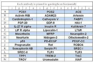 - ACE (CD143), Activin R1B (ALK-4), ADAM23, Cardiotrophin-1 (CT-1), CD23, FABP1, GDF-8 (Myostatin), HAI-1, HIF-1 alpha, IL-27, IL-27 R alpha, Insulin R (CD220), LIF R alpha, Lipocalin-1, LRP-6, Lymphotoxin beta R (TNF RIII), Mesothelin, MFRP, Neuropilin-2, Neurturin, Nidogen-2, NRG1-alpha (HRG1-alpha), Olfactomedin-2 (Noelin-2), p53, PD-ECGF (Thymidine Phosphorylase), PDGF-C, Progranulin, RET (P-Tyr), ROBO4, Semaphorin 6B, SERPINF1 (PEDF), SREC-I (SCARF1), SREC-II (SCARF2), TLR1, TLR3, TREM-2, Tripeptidyl-peptidase I (TPP1), TRKC, TROY (TNFRSF19), XIAP