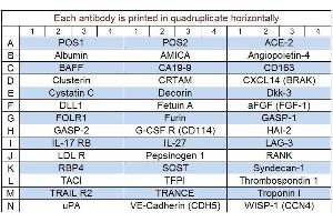 - ACE-2, aFGF (FGF-1), Albumin, AMICA, Angiopoietin-4, BAFF, CA19-9, CD163, Clusterin, CRTAM, CXCL14 (BRAK), Cystatin C, Decorin, Dkk-3, DLL1, Fetuin A, FOLR1, Furin, GASP-1 (WFIKKNRP), GASP-2 (WFIKKN), GCSF R (CD114), HAI-2, IL-17 RB, IL-27, LAG-3, LDL R, Pepsinogen 1, RANK (TNFRSF11A), RBP4, SOST, Syndecan-1, TACI (TNFRSF13B), TFPI, Thrombospondin 1, TRAIL R2 (TNFRSF10B/DR5), TRANCE (TNFSF11), Troponin I, uPA, VE-Cadherin (CDH5), WISP-1 (CCN4)