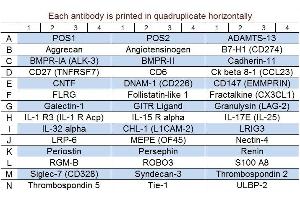 - ADAMTS-13, Aggrecan, Angiotensinogen (SERPINA8), B7-H1 (CD274), BMPR-IA (ALK-3), BMPR-II, Cadherin-11, CD27 (TNFRSF7), CD6, Ck beta 8-1 (CCL23), CNTF, DNAM-1 (CD226), CD147 (EMMPRIN), FLRG, Follistatin-like 1, Fractalkine (CX3CL1), Galectin-1, GITR Ligand (TNFSF18), Granulysin (NKG5/LAG-2), IL-1 R3 (IL-1 R Acp), IL-15 R alpha, IL-17E (IL-25), IL-32 alpha, CHL-1 (L1CAM-2), LRIG3, LRP-6, MEPE (OF45), Nectin-4, Periostin, Persephin, Renin, RGM-B, ROBO3, S100 A8, Siglec-7 (CD328), Syndecan-3, Thrombospondin 2, Thrombospondin 5 (COMP), Tie-1, ULBP-2 (ALCAN-alpha/N2DL2)