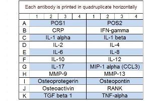 - CRP (C-Reactive Protein), IFN-gamma, IL-1 alpha (IL-1 F1), IL-1 beta (IL-1 F2), IL-10, IL-12 p70, IL-17A, IL-2, IL-4, IL-6, IL-8 (CXCL8), MIP-1 alpha (CCL3), MMP-13, MMP-9, Osteoactivin (GPNMB), Osteopontin (SPP1), Osteoprotegerin (TNFRSF11B), RANK (TNFRSF11A), TGF beta 1, TNF alpha