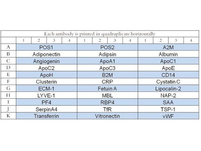 - Adiponectin (ACRP30), Adipsin (Complement Factor D), Albumin, Alpha-2 Macroglobulin, Angiogenin, ApoA, ApoC1, ApoC2, ApoC3, ApoE, ApoH, Beta-2 Microglobulin, CD14, Clusterin, CRP (C-Reactive Protein), Cystatin C, ECM-1, Fetuin A, Lipocalin-2 (NGAL), LYVE-1, MBL, NAP-2 (PPBP/CXCL7), Platelet Factor 4 (CXCL4), RBP4, SAA (Serum Amyloid A), SERPINA4, TfR (Transferrin R), Thrombospondin 1, Transferrin, Vitronectin, VWF
