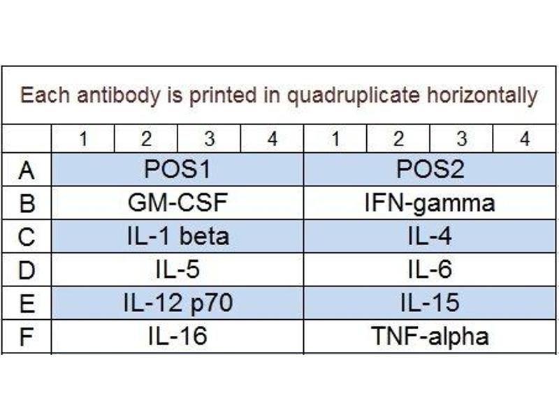 - GM-CSF, IFN-gamma, IL-1 beta (IL-1 F2), IL-4, IL-5, IL-6, IL-12 p70, IL-15, IL-16, TNF alpha