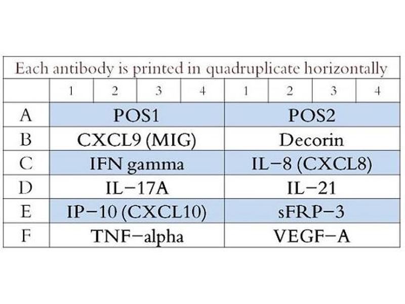 - Decorin, IFN-gamma, IL-17A, IL-21, IL-8, IP-10 (CXCL10), MIG (CXCL9), sFRP-3, TNF alpha, VEGF-A