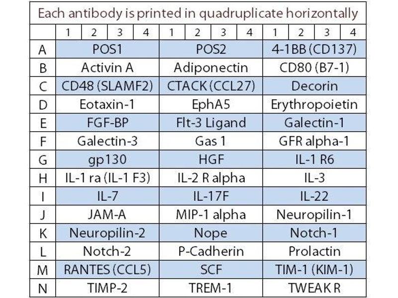 - 4-1BB (TNFRSF9/CD137), Activin A, Adiponectin (ACRP30), CD80 (B7-1), CD48 (SLAMF2), CTACK (CCL27), Decorin, Eotaxin-1 (CCL11), EphA5, Erythropoietin, FGF-BP, Flt-3 Ligand, Galectin-1, Galectin-3, Gas 1, GFR alpha-1 (GDNF R), gp130, HGF, IL-1 R6 (IL-1 Rrp2), IL-1 ra (IL-1 F3), IL-2 R alpha, IL-3, IL-7, IL-17F, IL-22, JAM-A (CD321/F11R), MIP-1 alpha (CCL3), Neuropilin-1, Neuropilin-2, Nope, Notch-1, Notch-2, P-Cadherin, Prolactin, RANTES (CCL5), SCF, TIM-1 (KIM-1), TIMP-2, TREM-1, TWEAK R (TNFRSF12)