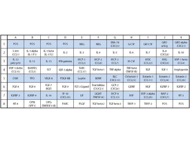 - ENA-78 (CXCL5), GCSF, GM-CSF, GRO alpha/beta/gamma, GRO alpha (CXCL1), I-309 (TCA-3/CCL1), IL-1 alpha (IL-1 F1), IL-1 beta (IL-1 F2), IL-2, IL-3, IL-4, IL-5, IL-6, IL-7, IL-8 (CXCL8), IL-10, IL-12 p40/p70, IL-13, IL-15, IFN-gamma, MCP-1 (CCL2), MCP-2 (CCL8), MCP-3 (MARC/CCL7), M-CSF, MDC (CCL22), MIG (CXCL9), MIP-1 beta (CCL4), MIP-1 delta (CCL15), RANTES (CCL5), SCF, SDF-1 alpha (CXCL12 alpha), TARC (CCL17), TGF beta 1, TNF alpha, TNF beta (TNFSF1B), EGF, IGF-1, Angiogenin, Oncostatin M, Thrombopoietin (TPO), VEGF-A, PDGF-BB, Leptin, BDNF, BLC (CXCL13), Ck beta 8-1 (CCL23), Eotaxin-1 (CCL11), Eotaxin-2 (MPIF-2/CCL24), Eotaxin-3 (CCL26), FGF-4, FGF-6, FGF-7 (KGF), FGF-9, Flt-3 Ligand, Fractalkine (CX3CL1), GCP-2 (CXCL6), GDNF, HGF, IGFBP-1, IGFBP-2, IGFBP-3, IGFBP-4, IL-16, IP-10 (CXCL10), LIF, Light (TNFSF14), MCP-4 (CCL13), MIF, MIP-3 alpha (CCL20), NAP-2 (PPBP/CXCL7), NT-3, NT-4, Osteopontin (SPP1), Osteoprotegerin (TNFRSF11B), PARC (CCL18), PLGF, TGF beta 2, TGF beta 3, TIMP-1, TIMP-2