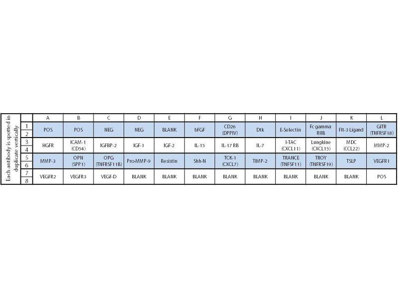 - BFGF, CD26 (DPPIV), Dtk, E-Selectin, Fc gamma RIIB (CD32b), Flt-3 Ligand, GITR (TNFRSF18), HGFR, ICAM-1 (CD54), IGFBP-2, IGF-1, IGF-2, IL-15, IL-17 RB, IL-7, I-TAC (CXCL11), Lungkine (CXCL15), MDC (CCL22), MMP-2, MMP-3, Osteopontin (SPP1), Osteoprotegerin (TNFRSF11B), Pro-MMP-9, Resistin, Sonic Hedgehog N-Terminal (Shh-N), TCK-1 (CXCL7), TIMP-2, TRANCE (TNFSF11), TROY (TNFRSF19), TSLP, VEGFR1, VEGFR2, VEGFR3, VEGF-D
