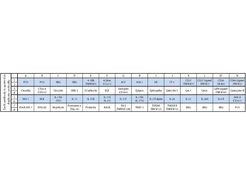 - 4-1BB (TNFRSF9/CD137), 6Ckine (CCL21), ACE, ALK-1, Amphiregulin, Cardiotrophin-1 (CT-1), CD27 (TNFRSF7), CD27 Ligand (TNFSF7), CD36 (SR-B3), CD40 Ligand (TNFSF5), Chordin, CTLA-4 (CD152), Decorin, DKK-1, E-Cadherin, EGF, Endoglin (CD105), Epigen, Epiregulin, Galectin-1, Gas 1, Gas 6, GITR Ligand (TNFSF18), Granzyme B, HAI-1, HGF, IL-1 R4 (ST2), IL-11, IL-17B, IL-17E (IL-25), IL-17F, IL-1 RA (IL-1 F3), IL-2 R alpha, IL-20, IL-21, IL-28A (IFN-lambda 2), IL-6 R, JAM-A (CD321/F11R), MAdCAM-1, MFG-E8, Neprilysin, Pentraxin-3 (TSG-14), Prolactin, RAGE, TACI (TNFRSF13B), TREM-1, TWEAK (TNFSF12), TWEAK R (TNFRSF12)