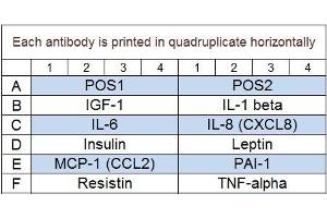 - IGF-1, IL-1 beta (IL-1 F2), IL-6, IL-8 (CXCL8), Insulin, Leptin, MCP-1 (CCL2), PAI-1, Resistin, TNF alpha