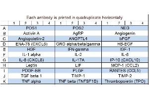 - Activin A, AgRP, Angiogenin, Angiopoietin-2, ANGPTL4, bFGF, ENA-78 (CXCL5), GRO alpha/beta/gamma, HB-EGF, HGF, IFN-gamma, IGF-1, IL-1 alpha (IL-1 F1), IL-2, IL-6, IL-8 (CXCL8), IL-17A, IP-10 (CXCL10), Leptin, LIF, MCP-1 (CCL2), PDGF-BB, PLGF, RANTES (CCL5), TGF beta 1, TIMP-1, TIMP-2, TNF alpha, TNF beta (TNFSF1B), Thrombopoietin (TPO)