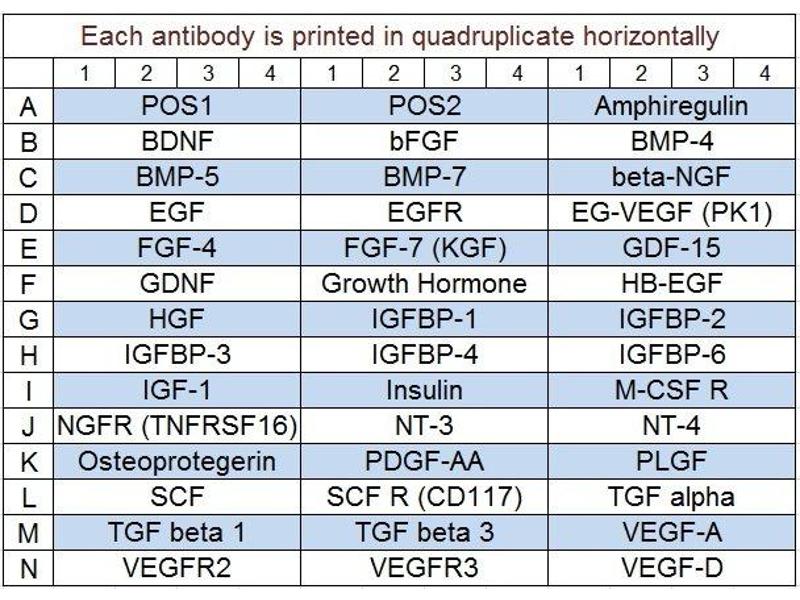 - Amphiregulin, BDNF, bFGF, BMP-4, BMP-5, BMP-7, beta-NGF, EGF, EGFR, EG-VEGF (PK1), FGF-4, FGF-7 (KGF), GDF-15, GDNF, Growth Hormone, HB-EGF, HGF, IGFBP-1, IGFBP-2, IGFBP-3, IGFBP-4, IGFBP-6, IGF-1, Insulin, M-CSF R, NGFR (TNFRSF16), NT-3, NT-4, Osteoprotegerin (TNFRSF11B), PDGF-AA, PLGF, SCF, SCF R (CD117/c-kit), TGF alpha, TGF beta 1, TGF beta 3, VEGF-A, VEGFR2, VEGFR3, VEGF-D