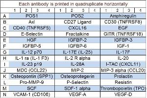 - Amphiregulin, Axl, CD27 Ligand (TNFSF7), CD30 (TNFRSF8), CD40 (TNFRSF5), CXCL16, EGF, E-Selectin, Fractalkine (CX3CL1), GITR (TNFRSF18), HGF, IGF-1, IGFBP-2, IGFBP-3, IGFBP-5, IGFBP-6, IL-1 ra (IL-1 F3), IL-12 p70, IL-17E (IL-25), IL-17F, IL-2 R alpha, IL-20, IL-23 p19, IL-28A (IFN-lambda 2), I-TAC (CXCL11), MDC (CCL22), MIP-2, MIP-3 alpha (CCL20), Osteopontin (SPP1), Osteoprotegerin (TNFRSF11B), Prolactin, Pro-MMP-9, P-Selectin, Resistin, SCF, SDF-1 alpha (CXCL12 alpha), Thrombopoietin (TPO), VCAM-1 (CD106), VEGF-A, VEGF-D