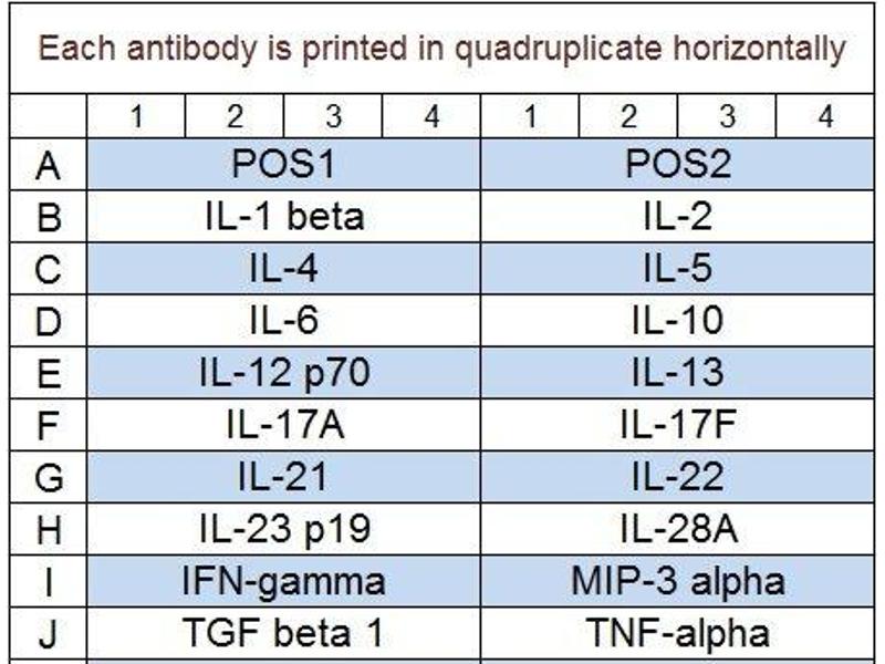 - IFN-gamma, IL-1 beta (IL-1 F2), IL-10, IL-12 p70, IL-13, IL-17A, IL-17F, IL-2, IL-21, IL-22, IL-23 p19, IL-28A (IFN-lambda 2), IL-4, IL-5, IL-6, MIP-3 alpha (CCL20), TGF beta 1, TNF alpha