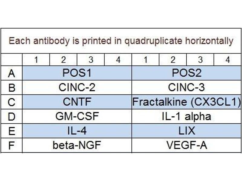 - CINC-2, CINC-3, CNTF, Fractalkine (CX3CL1), GM-CSF, IL-1 alpha (IL-1 F1), IL-4, LIX, beta-NGF, VEGF-A