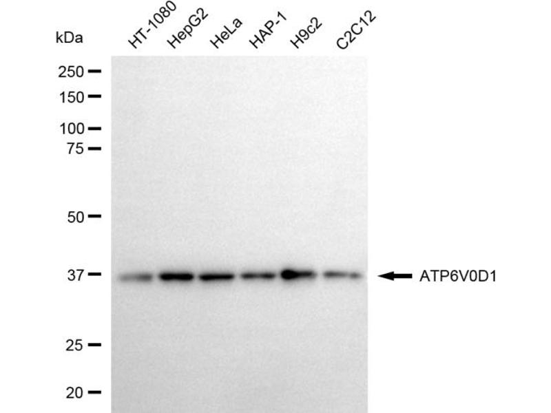 : "Proteomic analysis of endosomes from genetically modified p14/MP1 mouse embryonic fibroblasts." in: Proteomics, Vol. 10, Issue 22, pp. 4117-27, (2010) (PubMed).Aliase für ATP6V0D1 Antikörper