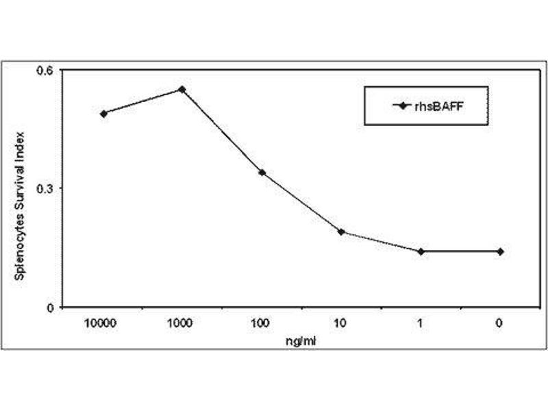 The protein encoded by this gene is a cytokine that belongs to the tumor necrosis factor (TNF) ligand family. This cytokine is a ligand for receptors TNFRSF13B/TACI, TNFRSF17/BCMA, and TNFRSF13C/BAFFR. This cytokine is expressed in B cell lineage cells, and acts as a potent B cell activator. It has been also shown to play an important role in the proliferation and differentiation of B cells. Alternatively spliced transcript variants encoding distinct isoforms have been identified. [provided by RefSeq, Mar 2011].