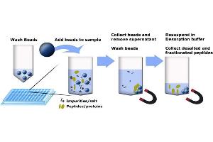 MagSi-proteomics beads are magnetic silica beads coated with C4, C8 or C18 alkyl groups, providing a reversed phase (RP) surface chemistry. The beads are an ideal tool for protein and peptide sample concentration, desalting and fractionation, and reduce sample complexity. The different versions of MagSi-proteomics beads are intended for: