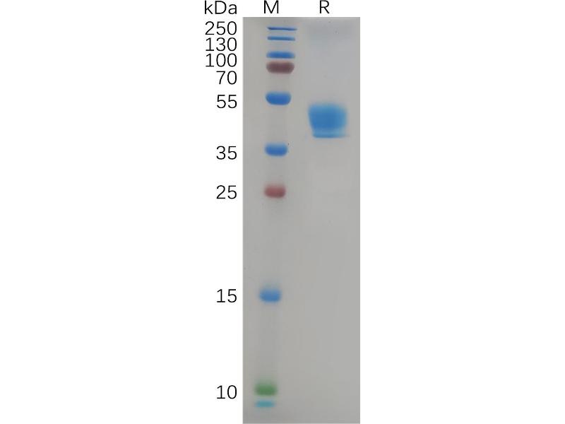The purity of the protein is greater than 95 % as determined by SDS-PAGE and Coomassie blue staining.
