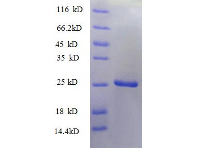 The purity of the protein is greater than 90 % as determined by SDS-PAGE and Coomassie blue staining.