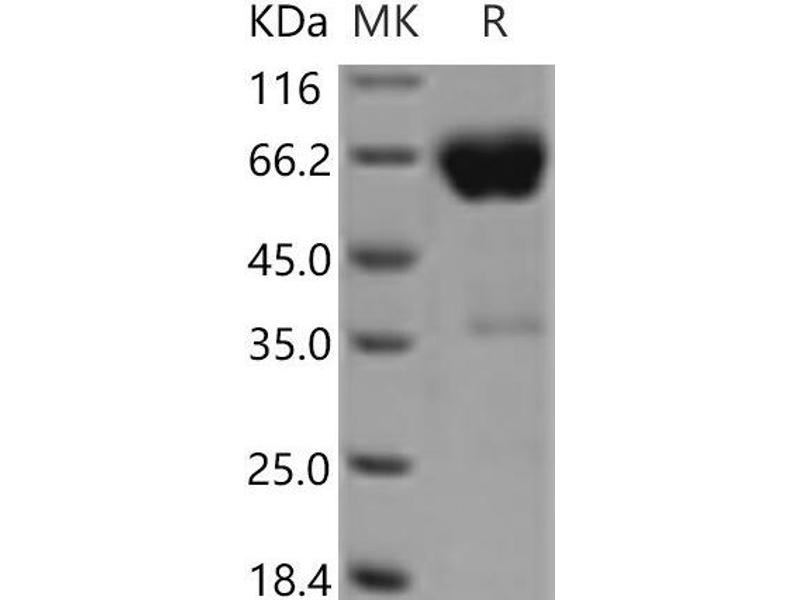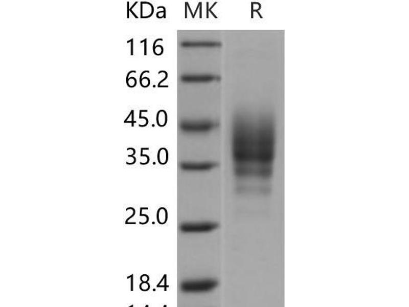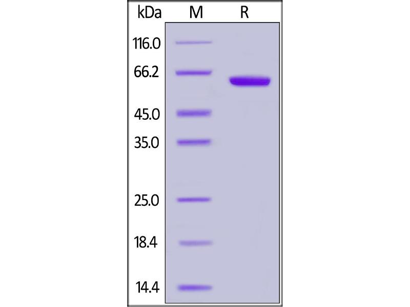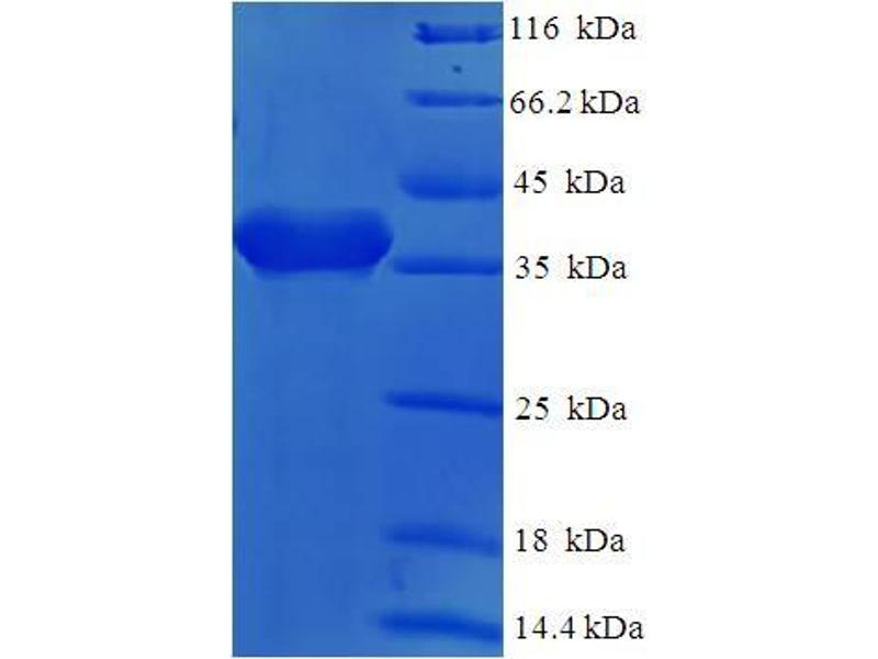 The purity of the protein is greater than 90 % as determined by SDS-PAGE and Coomassie blue staining.