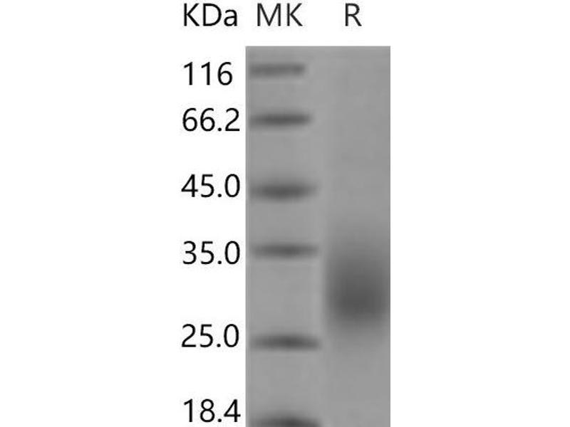 The purity of the protein is greater than 90 % as determined by SDS-PAGE and Coomassie blue staining.