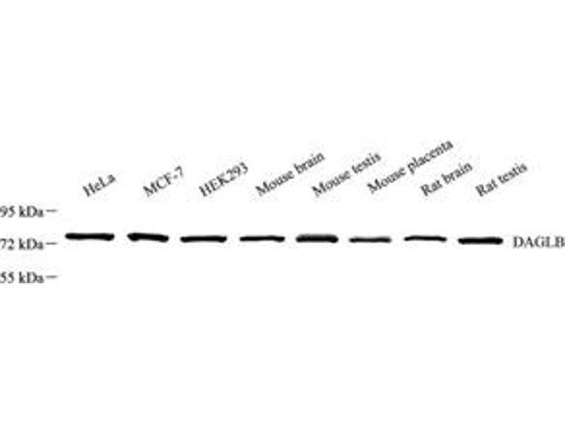 : "Cloning of the first sn1-DAG lipases points to the spatial and temporal regulation of endocannabinoid signaling in the brain." in: The Journal of cell biology, Vol. 163, Issue 3, pp. 463-8, (2003) (PubMed).Aliase für DAGLB Antikörper