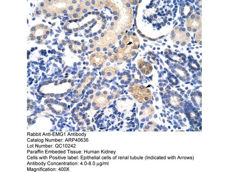 : "Mutation of a gene essential for ribosome biogenesis, EMG1, causes Bowen-Conradi syndrome." in: American journal of human genetics, Vol. 84, Issue 6, pp. 728-39, (2009) (PubMed).Aliase für EMG1 Antikörper