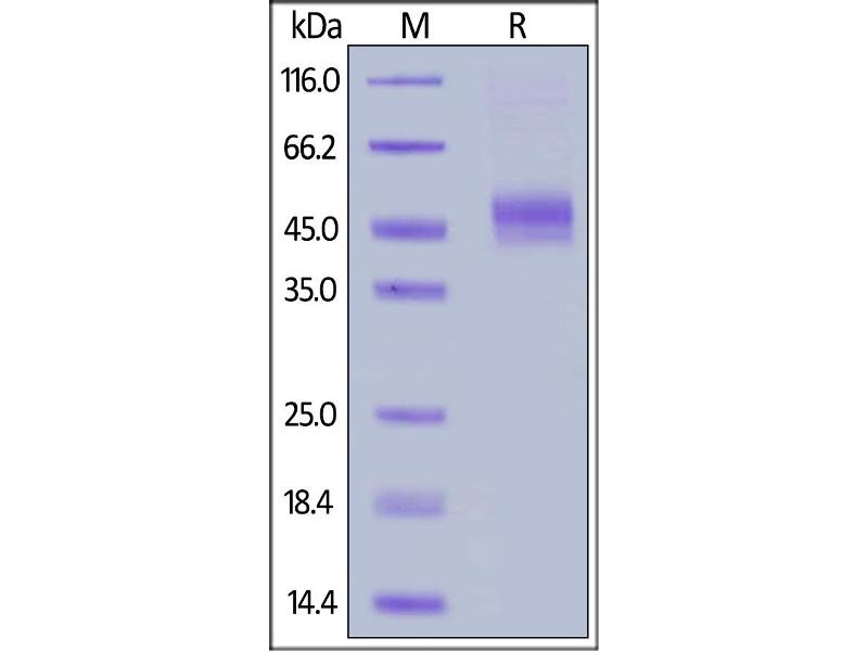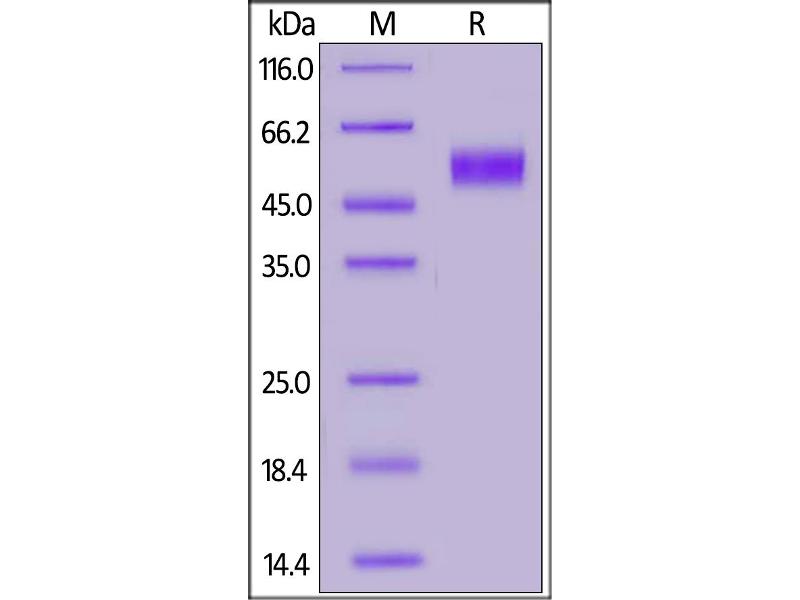 The purity of the protein is greater than 90 % as determined by SDS-PAGE and Coomassie blue staining.