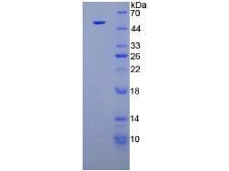 The purity of the protein is greater than 90 % as determined by SDS-PAGE and Coomassie blue staining.