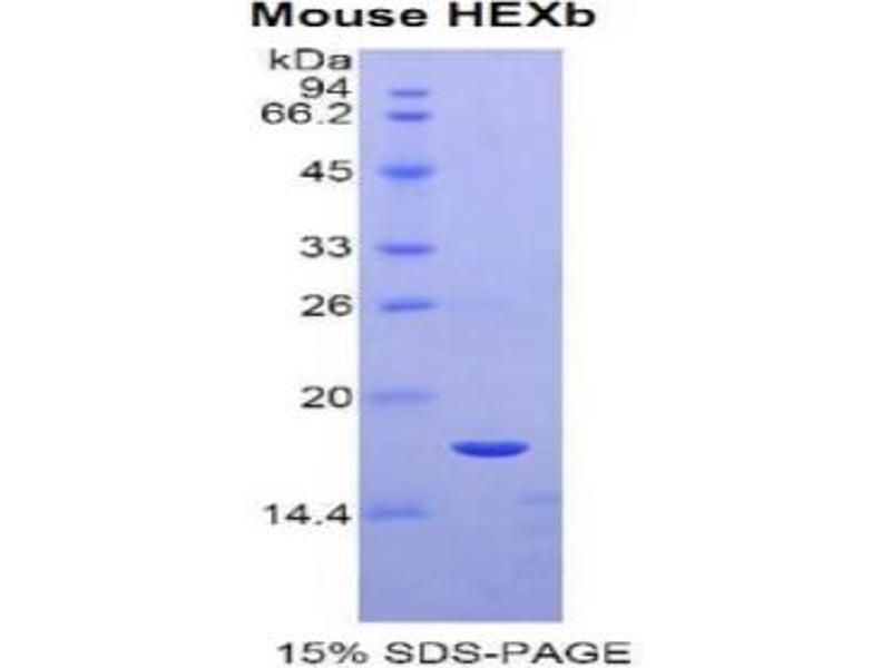 Hexosaminidase B is the beta subunit of the lysosomal enzyme beta-hexosaminidase that, together with the cofactor GM2 activator protein, catalyzes the degradation of the ganglioside GM2, and other molecules containing terminal N-acetyl hexosamines. Beta-hexosaminidase is composed of two subunits, alpha and beta, which are encoded by separate genes. Both beta-hexosaminidase alpha and beta subunits are members of family 20 of glycosyl hydrolases. Mutations in the alpha or beta subunit genes lead to an accumulation of GM2 ganglioside in neurons and neurodegenerative disorders termed the GM2 gangliosidoses. Beta subunit gene mutations lead to Sandhoff disease (GM2-gangliosidosis type II). [provided by RefSeq, Jul 2008].