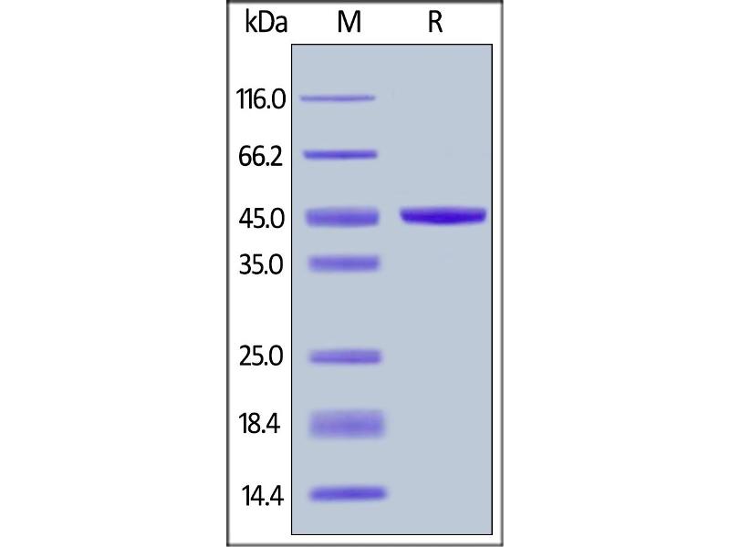 The purity of the protein is greater than 95 % as determined by SDS-PAGE and Coomassie blue staining.