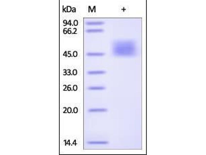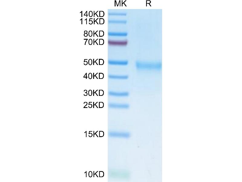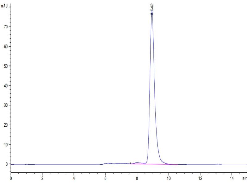 The purity of the protein is greater than 90 % as determined by SDS-PAGE and Coomassie blue staining.