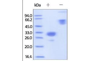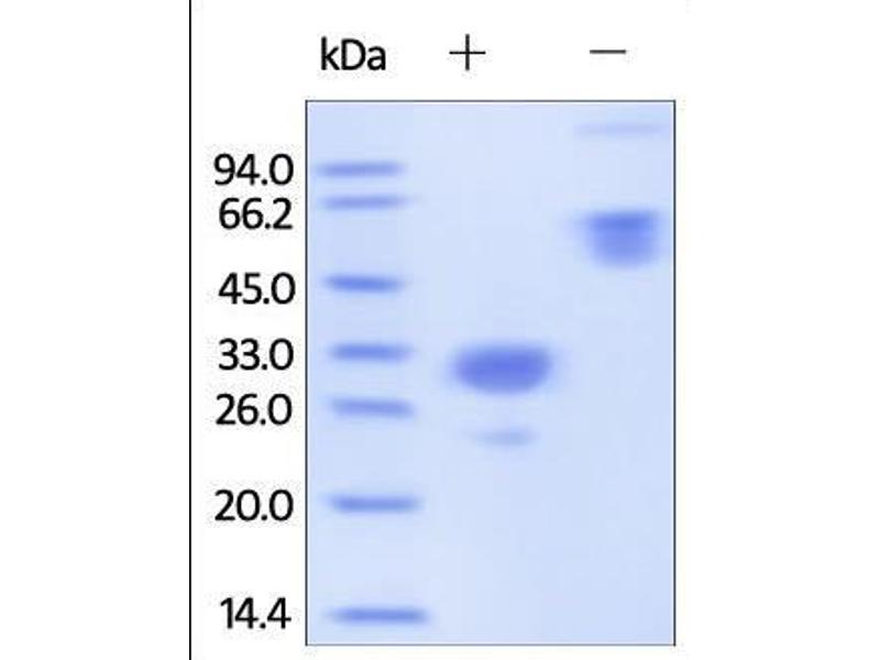- This protein carries no "tag". The protein has a calculated MW of 26.4 kDa. As a result of glycosylation, the protein migrates as 25-30 kDa under reducing (R) condition, and 50-60 kDa under non-reducing (NR) condition (SDS-PAGE).