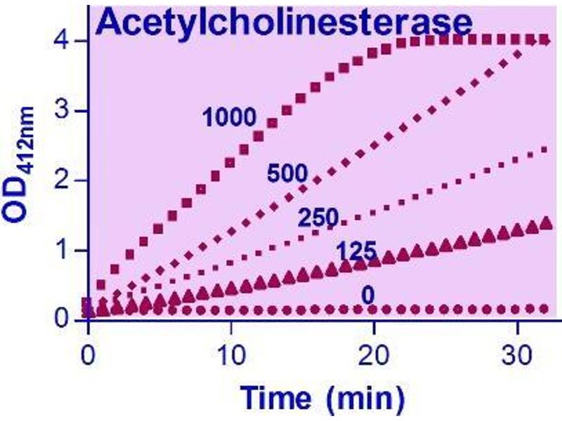 Acetylcholinesterase (EC 3.1.1.7, AChE), also known as RBC cholinesterase, is found primarily in the blood and neural synapses. Low serum cholinesterase activity may relate to exposure to insecticides or to one of a number of variant genotypes. AChE catalyzes the hydrolysis of the neurotransmitter acetylcholine into choline and acetic acid, a reaction necessary to allow a cholinergic neuron to return to its resting state after activation. Cholinesterase levels of cells and plasma are used as a guide in establishing safety precautions relative to exposure and contact, as well as a guide in determining the need for workers to be removed from areas of contact with the organic phosphate insecticides. Simple, direct and automation-ready procedures for measuring AChE activity are very desirable. This Acetylcholinesterase Assay is based on an improved Ellman method, in which thiocholine produced by the action of acetylcholinesterase forms a yellow color with 5,5'-dithiobis(2-nitrobenzoic acid). The intensity of the product color, measured at 412 nm, is proportionate to the enzyme activity in the sample.
