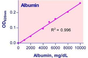 Sensitive and accurate. Use as little as 20 µL samples. Detection range 0.3 g/dL (45µM) to 5 g/dL (750µM) albumin in 96-well plate assay.