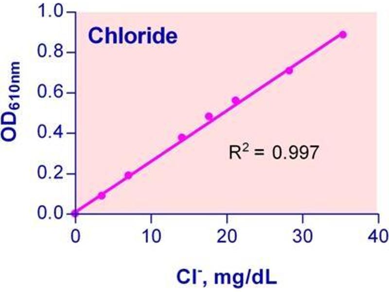 Sensitive and accurate. Use as little as 5 µL samples. Linear detection range 0.7 mg/dL (0.2mM) to 35 mg/dL (10mM) Cl - in 96-well plate assay.