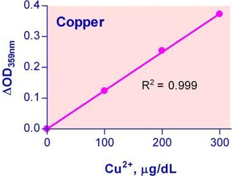 Sensitive and accurate. Linear detection range 7 µg/dL (1.0 µM) to 300 µg/dL (47 µM) copper in 96-well plate assay. Simple and high-throughput. The simple procedure can be readily automated as a high-throughput assay in 96-well plates for thousands of samples per day. Improved reagent stability and versatility. The optimized formulation has greatly enhanced reagent and signal stability. Cuvet or 96-well plate assay.