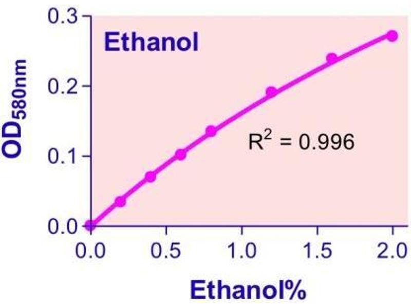 Alcoholic drinks are among the daily consumed beverages. Studies have shown heavy alcohol consumption may lead to various forms of liver diseases and to increased mortality rates. Quantitative determination of alcohol (ethanol, C2H5OH) finds applications in basic research, drug discovery, clinic studies and winery. Simple, direct and automation-ready procedures for measuring ethanol concentration are very desirable. This ethanol assay kit is based on an improved dichromate method, in which dichromate is reduced by ethanol to a bluish chromic (Cr 3+ ) product. The intensity of color, measured at 580 nm, is a direct measure of the alcohol concentration in the sample. The optimized formulation substantially reduces interference by substances in the raw samples and exhibits high sensitivity.