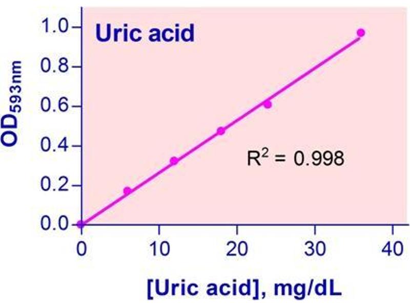 Sensitive and accurate. Use 5 µL samples. Linear detection range 0.22 mg/dL (13µM) to 30 mg/dL (2380µM) uric acid in 96-well plate assay.